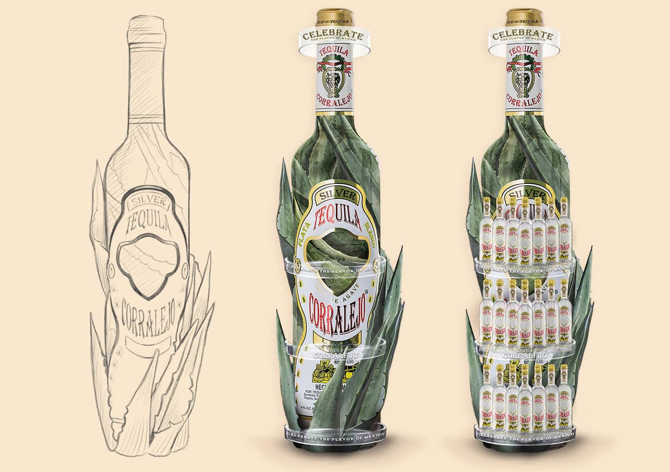 Not your average retail bin, this attention-grabbing display embraces the iconic shape of the Corralejo bottle itself and nods the key quality cue that it's crafted with 100% blue weber agave.