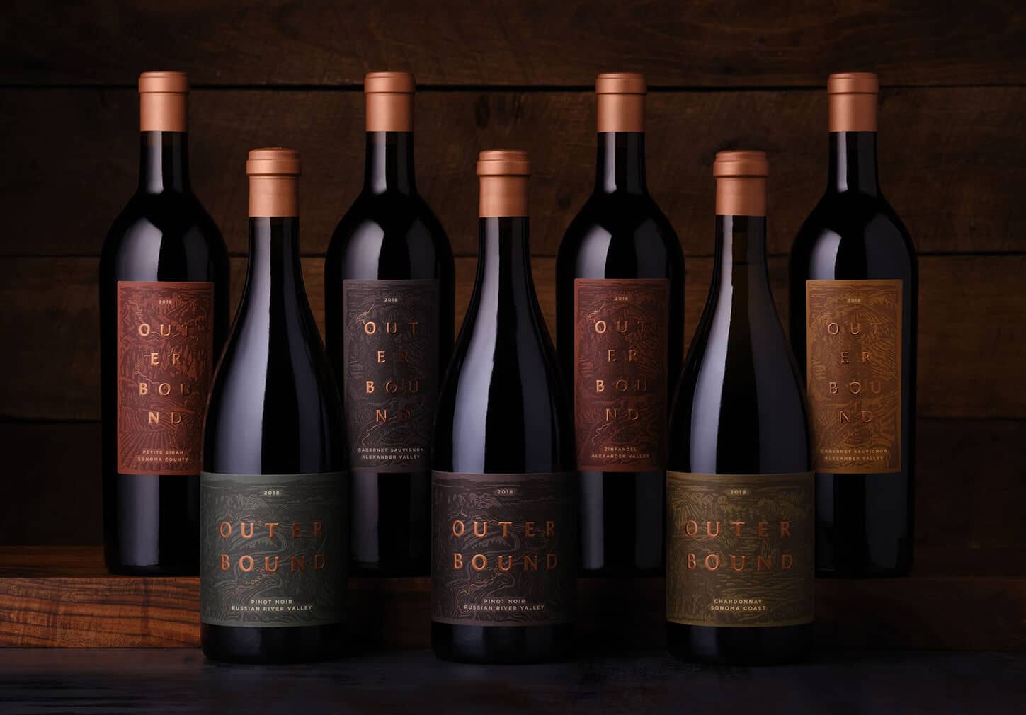 Label design comes in all shapes and forms, and in the case of Outerbound, it started with a carving knife and a linocut block of wood. On an expedition to the nooks and crannies of Sonoma wine country, our team toured the scenic mountains and iconic landmarks behind each region of Outerbound Wine. We then translated this adventure into a series of hand-etched wood carvings, the first step in developing the package for the lineup. Each label was then beautifully debossed with one of these woodcut carvings and accented by a path of copper foil, capturing the unique characteristics of each region's terroir.