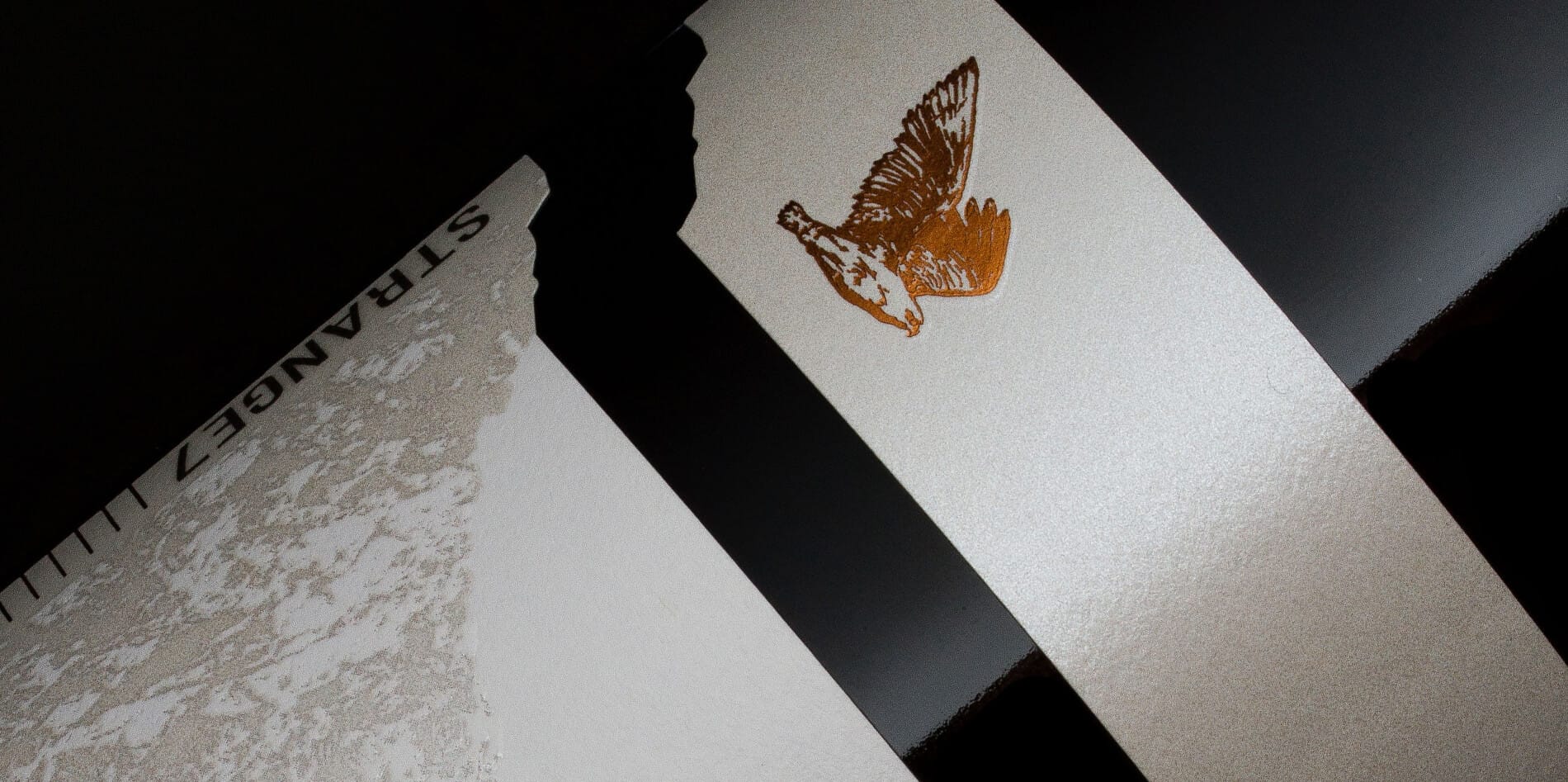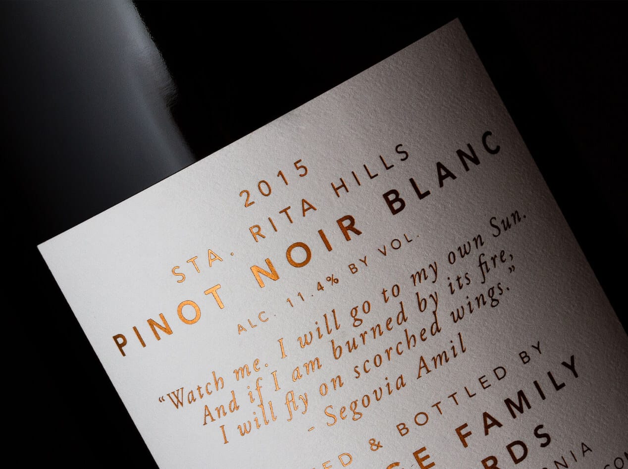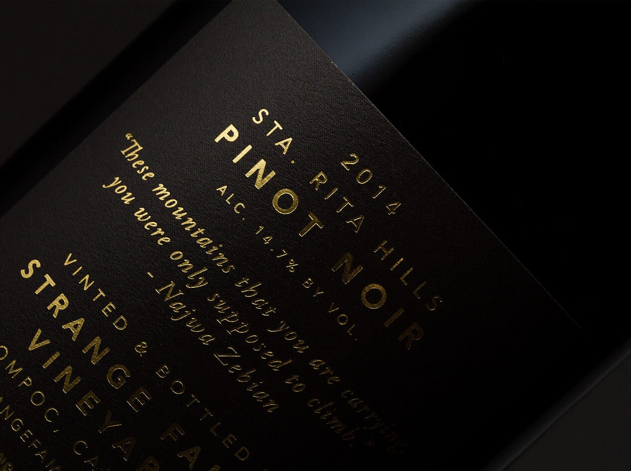 A blended family of seven, Strange Family Vineyards establishes new roots and pays tribute to their late son, brother and hero, Johnny. Making elegant, Burgundian style wines from their estate vineyard in the Santa Rita Hills became a way to celebrate his life and restore love and hope to their family. It is a very personal project, filled with passion, and was truly an honor for us to be a part of. In creating the label and branding, it was important that the artwork captured the fearless, free spirit of their son. The iconography of the eagle soaring from the mountainside, is broken up in to a dynamic two-piece label and brought to life through embossing, varnish and foil. The packaging as a whole feels both gritty and refined, combining darkness with a lightness that signifies choosing freedom over fear.