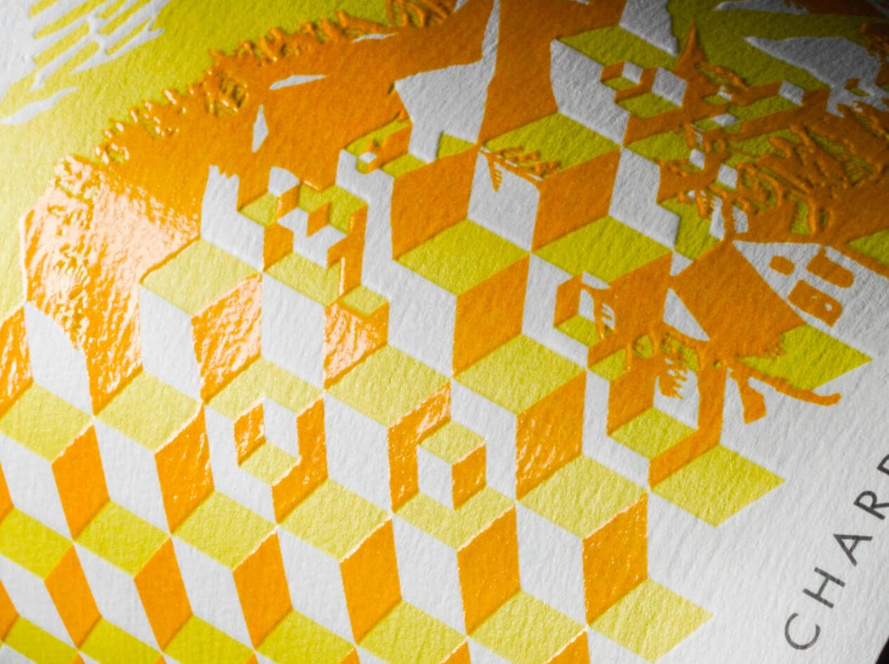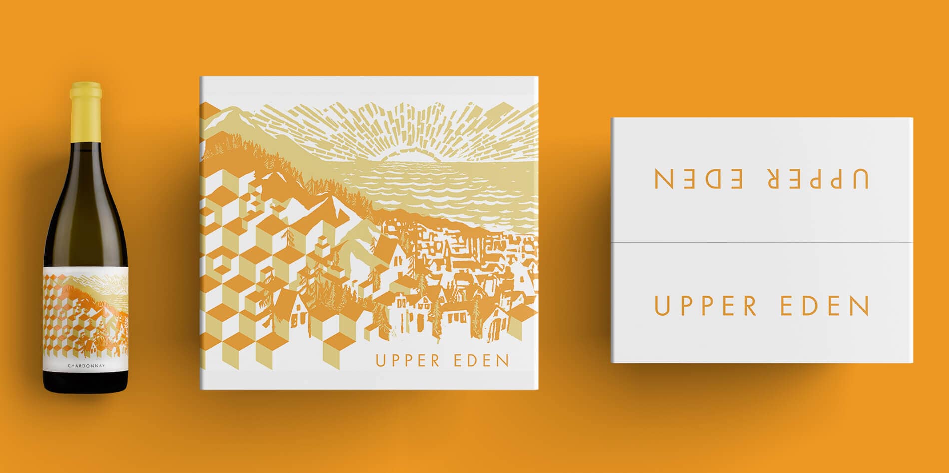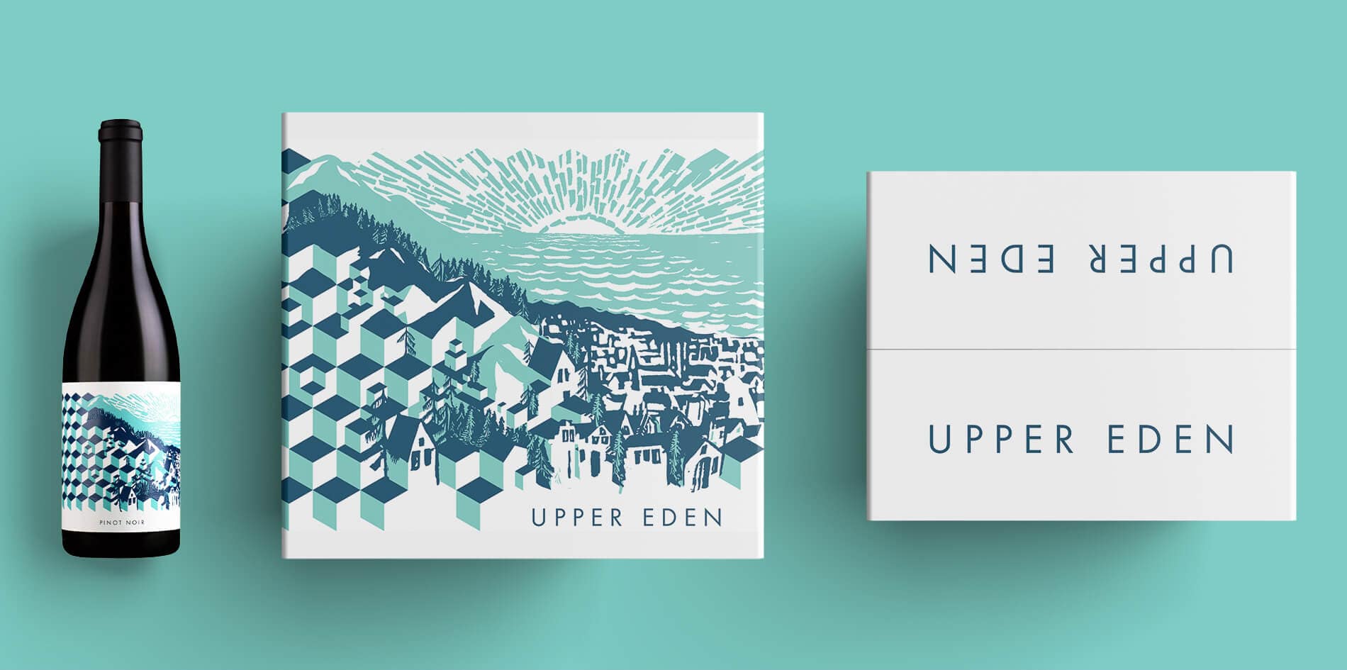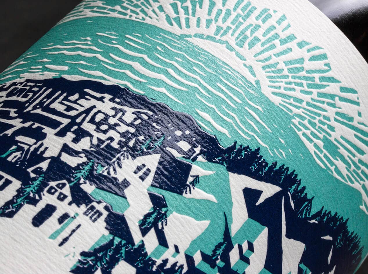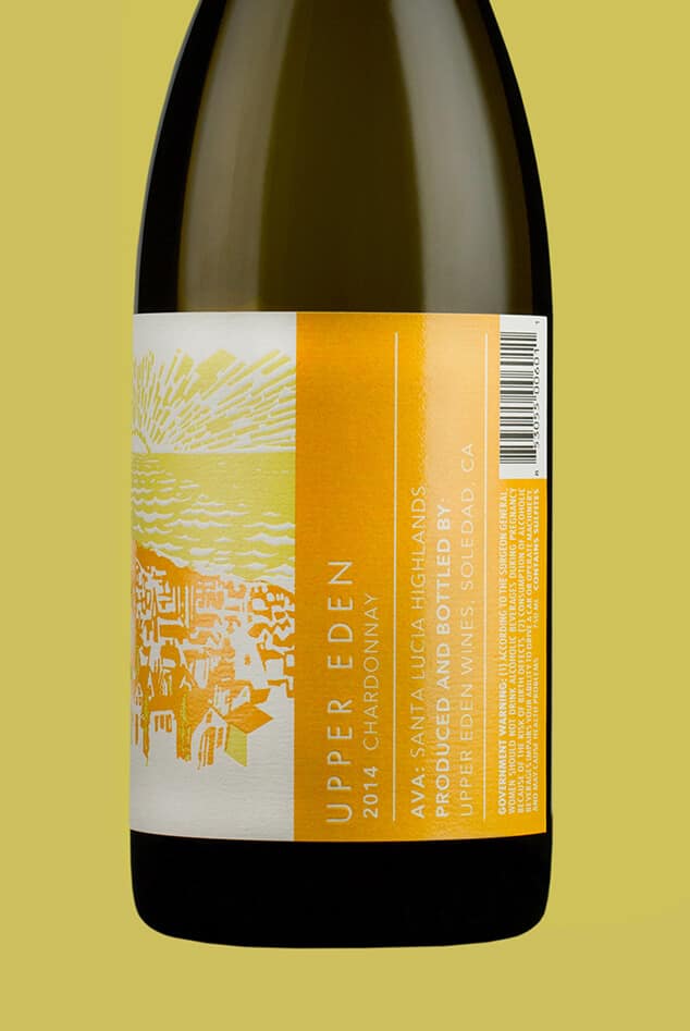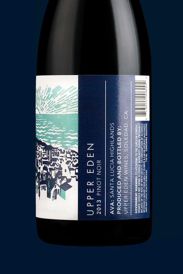 Inspired by Steinbeck's East of Eden and the sense of place that the upper Salinas Valley provides, Upper Eden is a study of extremes: vineyards are represented by an Escher-esque maze of blocks trickling down the hillside, while far in the distance, the gentle sea laps the shore of the town below. Natural elements in the label are debossed to create texture and are contrasted by glossy spot varnish to further define the differences between natural and manmade.